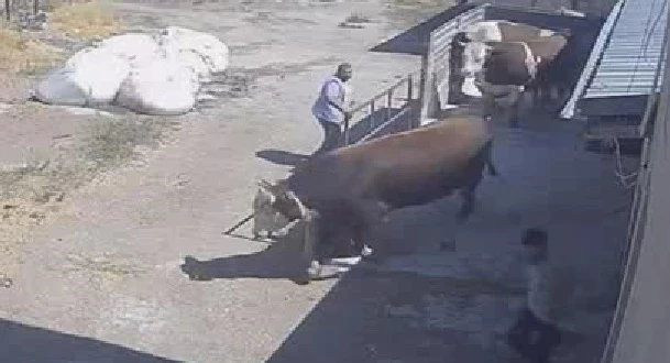 Huysuzlaşan boğa, boynuzlarıyla kapağı yerinden söktü. Kapağın çarptığı Demirel, metrelerce savrularak yere düştü. Kamyondan tekrar inen Demirel, boğanın saldırısından kaçarak kurtuldu.