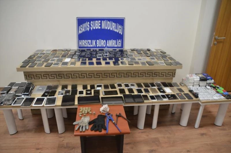 Süphelinin girisine "pitbull" cinsi köpegi bagladigi depoya baskin yapan polis ekipleri, 12 tablet bilgisayar, 116 akilli cep telefonu, 3 tuslu telefon, 111 arizali cep telefonu, 149 telefon aksesuari ve bir miktar para ele geçirdi.
