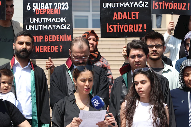 Depremde yıkılan Ebrar Sitesi'nde yakınlarını kaybeden aileler ile Kahramanmaraş Barosuna kayıtlı bazı avukatlar, pankartlarla adliye binası önünde bir araya geldi.