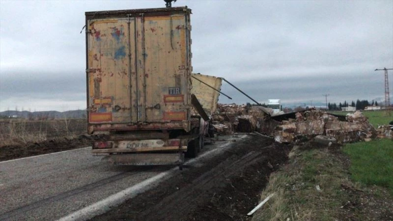Ali Pilis (32) yönetimindeki 27 ABZ 679 plakalı kağıt yüklü tır, Kahramanmaraş-Narlı Karayolu Özbek Mahallesi yakınlarında lastiğinin patlaması sonucu devrildi.