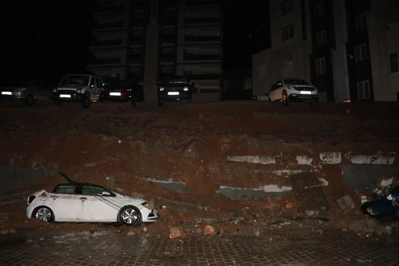Kahramanmaraş’ta etkili olan yağmur nedeniyle bir sitenin istinat duvarı çökerken, göçüğün altında kalan 3 otomobil hurdaya döndü.