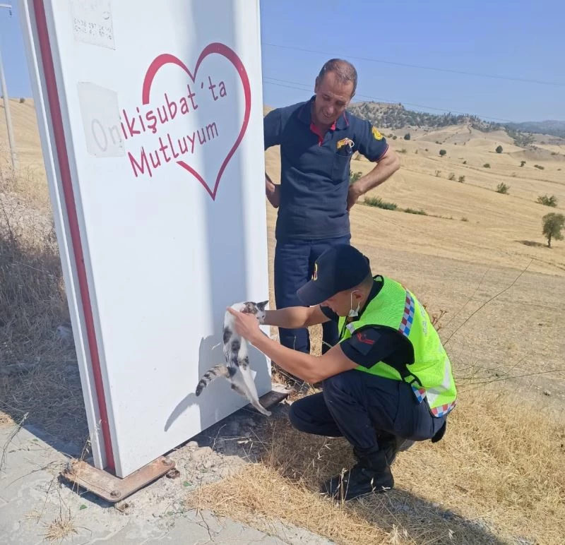Onikişubat ilçesi Kavlaklı Mahallesi’nde jandarma, sabit trafik kontrolü esnasında Kavlaklı Mahallesi tabelasına sıkıştığını gördü. Kedi sıkıştığı yerden jandarma trafik ve itfaiye ekiplerince kurtarıldı. Su verilen kedi doğal yaşamına kavuşturuldu.