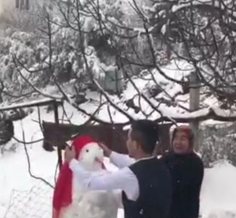 Kahramanmaraş’ta etkili olan kar yağışı sonrası bölge beyaza büründü. Onikişubat ilçesi Cüceli Mahallesinde bir genç kardan gelin yaptı. Geline kırmızı kurdele bağlayıp, takı taktılar.