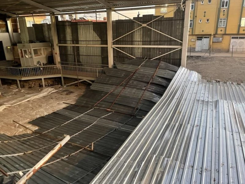 Uçan çatı parçaları kazı alanının üzerine düştü. Polis ekipleri bölgede güvenlik önlemi aldı.