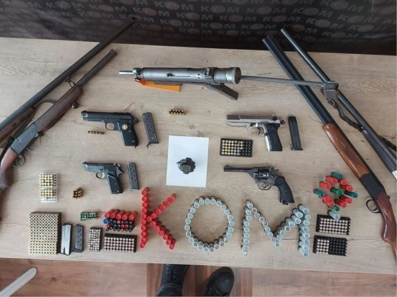 Şüphelilerin ikamet, iş yeri ve araçlarında yapılan aramalarda, 1 adet el bombası, 1 adet hafif makinalı tüfek, 3 adet ruhsatsız tabanca, 4 adet ruhsatsız av tüfeği, 1 adet kurusıkı tabanca ile çok sayıda tabanca mermisi ele geçirildi.