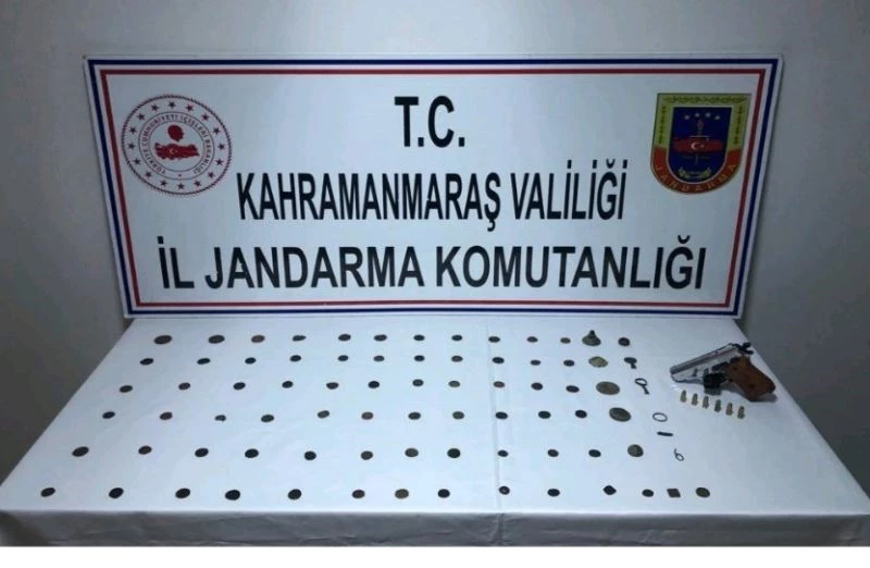 Edinilen bilgiye göre, İl Jandarma Komutanlığı ekipleri Türkoğlu ilçesi Kılılı Mahallesi’nde Y.A. isimli şahsın elinde bulunan tarihi eserleri satmak amacıyla müşteri aradığını belirledi. Düzenlenen operasyonda Roma dönemine ait olduğu değerlendirilen 68 adet sikke, 12 adet tarihi eser niteliğinde obje, 1 adet 7,65 mm çapında tabanca ve tabancaya ait fişekler ele geçirildi. Gözaltına alınan şahıs hakkında yasal işlem başlatıldı.
