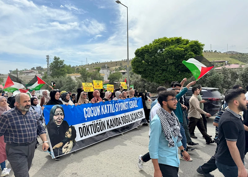 Türkoğlu Meslek Yüksekokulu Kampüsü'nde bir araya gelen öğrenciler, ellerinde bayrak ve pankartlarla "Hamas'a selam direnişe devam", "Direniş her yerde", "Katil İsrail Filistin'den defol", "Batı'nın yalanı insan hakları", "Cenk, cihat, şehadet" ve "Nehirden denize özgür Filistin" sloganları atarak Türkoğlu Millet Meydanı'na kadar yürüdü.