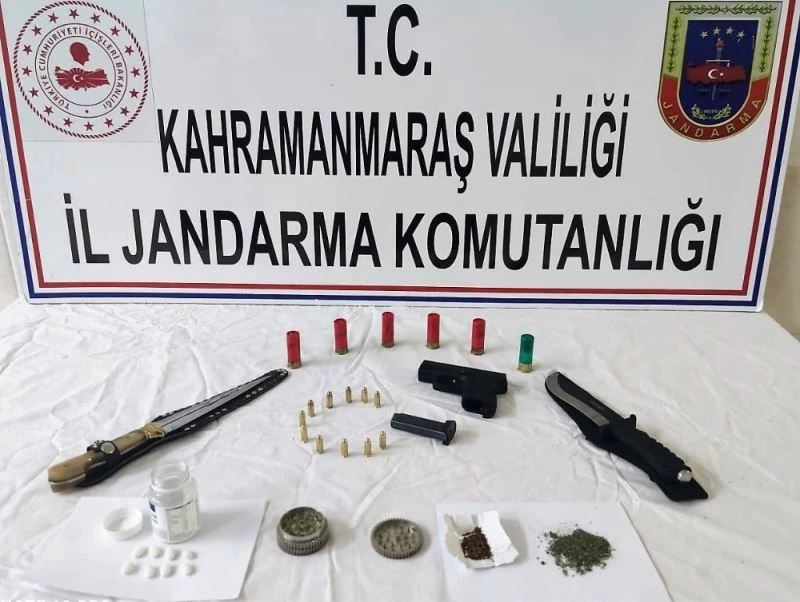 Edinilen bilgiye göre, İlçe Jandarma Komutanlığı ekipleri, Göksun’a bağlı Tombak Mahallesinde Önleyici Kolluk Devriyesi esnasında şüphe üzerine bir otomobili durdurdu. Yapılan aramada, 15 gram kubar esrar maddesi ve kağıt içerisine sarılı tütün ile karıştırılmış olduğu değerlendirilen 5 gram kubar esrar, 1 adet esrar öğütmeye yarayan aparat, kutu içerisinde 8 adet ekstazi olduğu değerlendirilen madde, 1 adet ruhsatsız tabanca ve tabancaya ait 11 adet mermi, 6 adet dolu kartuş, 1 adet 30 cm uzunluğunda kasatura, 1 adet el yapımı 35 cm uzunluğunda kasatura ele geçirildi.