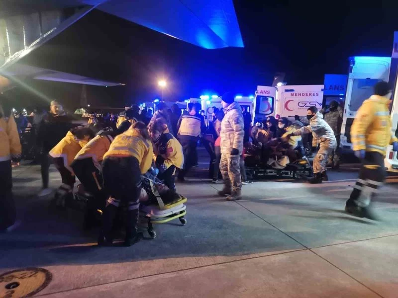 Türkiye’yi yasa boğan depremlerde Kahramanmaraş’ta enkaz altından kurtartılan 51’i ağır toplamda 54 depremzedeyi taşıyan askeri ambulans uçaklardan ilki İzmir Adnan Menderes Havalimanı Meydan Kıta Komutanlığı’na iniş yaptı. Burada hazır halde bekletilen ambulanslara alınan yaralılar, tedavileri yapılmak üzere kentteki çeşitli hastanelere götürüldü.