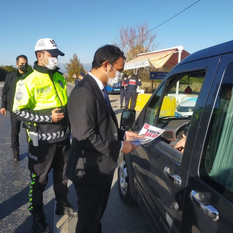 Uygulamaya katılan İlçe Kaymakamı Abdulkadir Şahin, İlçe Jandarma Komutanı Ayhan Dölek ve Bölge Trafik Amiri Muhammet Talha Tutar durdurulan araçların sürücüleri ve araç içerisinde bulunan yolculara, emniyet kemeri kullanımının önemini hatırlatarak bilgilendirici broşür verdi.