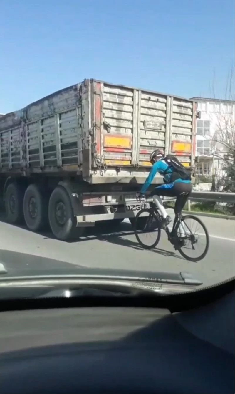 Hatay’ın Dörtyol ilçesinde bir kişinin bisikletiyle kamyon arkasındaki tehlikeli yolculuğu kameralara yansıdı.