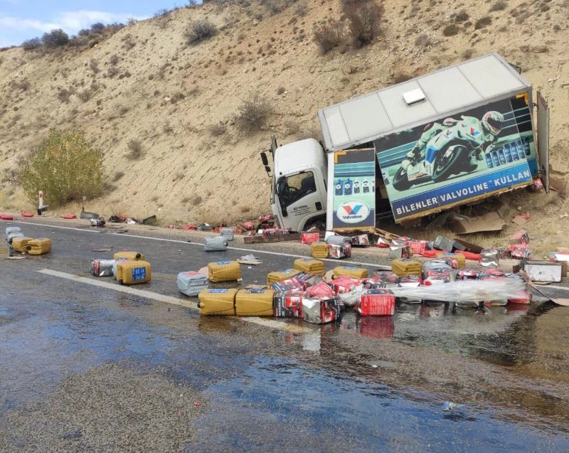 Sivas’ın Gürün ilçesinde madeni yağ dolu kamyon devrildi, yağlar yola saçıldı.