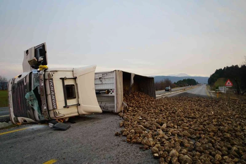 Kamyon devrildi, şeker pancarları yola saçıldı: 1 yaralı