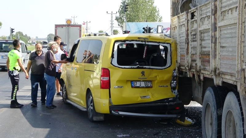 Antalya’nın Manavgat ilçesi Ulualan mevkiinde kırmızı ışıkta bekleyen araçlara, aynı istikamette seyir halindeki iş makinesi kamyon arkadan çarptı. Kamyon, içerisinde turist bulunan ticari taksiyi sıkıştırarak büyük hasar oluşmasına neden olurken, şans eseri kimsenin burnu bile kanamadı. Ticari Taksi sürücüsü Süleyman Kurşun, kırmızı ışıkta beklerken bir anda kamyonun aracına çarpıp sürüklediğini, kendisinin de önünde bulunan araca çarptığını söyledi.