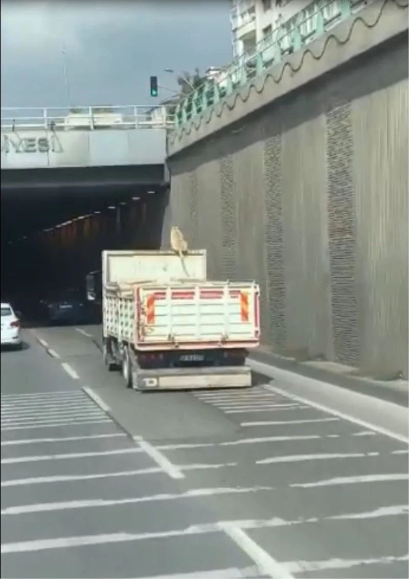 Kocaeli’de D-100 üzerinde seyir halinde olan kamyonun üzerinde seyir olan köpek ağızları yüreklere getirdi.