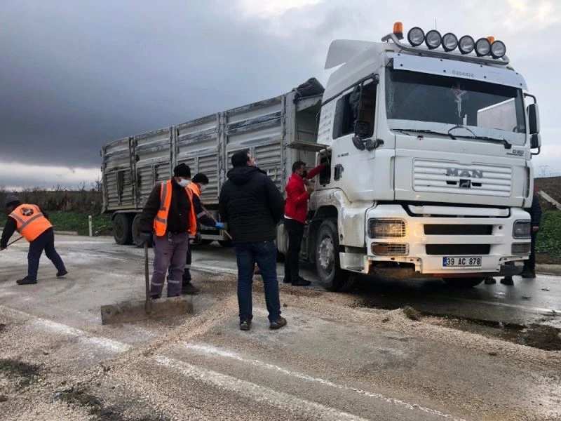 Kırklareli’de Lüleburgaz ile Pınarhisar ilçeleri arasında seyir halindeki kamyonun kayması ve yoldan çıkmasıyla maddi hasarlı kaza meydana geldi. Kazanın ardından ulaşımın aksaması sebebiyle yaklaşık 900 araçlık konvoy oluştu.