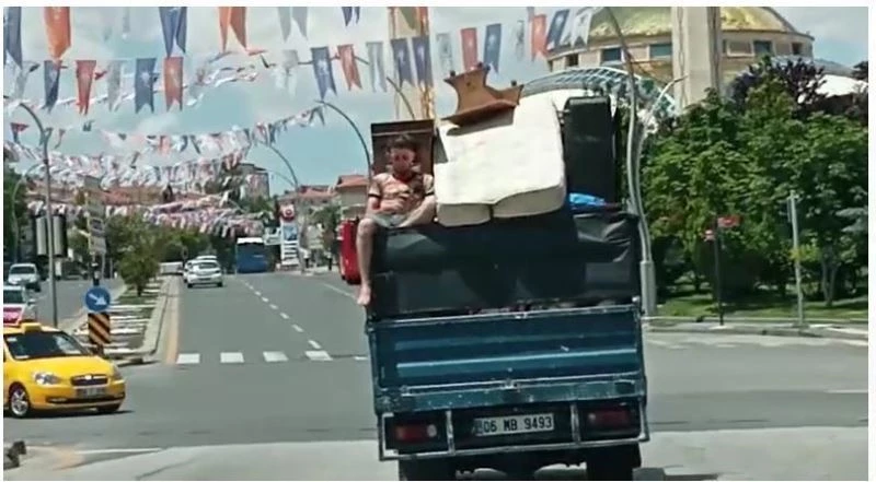 Ankara’da seyir halindeki kamyonetin eşya yüklü kasasında oturan bir vatandaş, hem kendi canını hem de trafik güvenliğini hiçe saydı. Normal bir yolculuk yapıyormuş gibi elindeki telefonla ilgilenen duyarsız şahsın rahat tavırları ise ‘pes’ dedirtti.