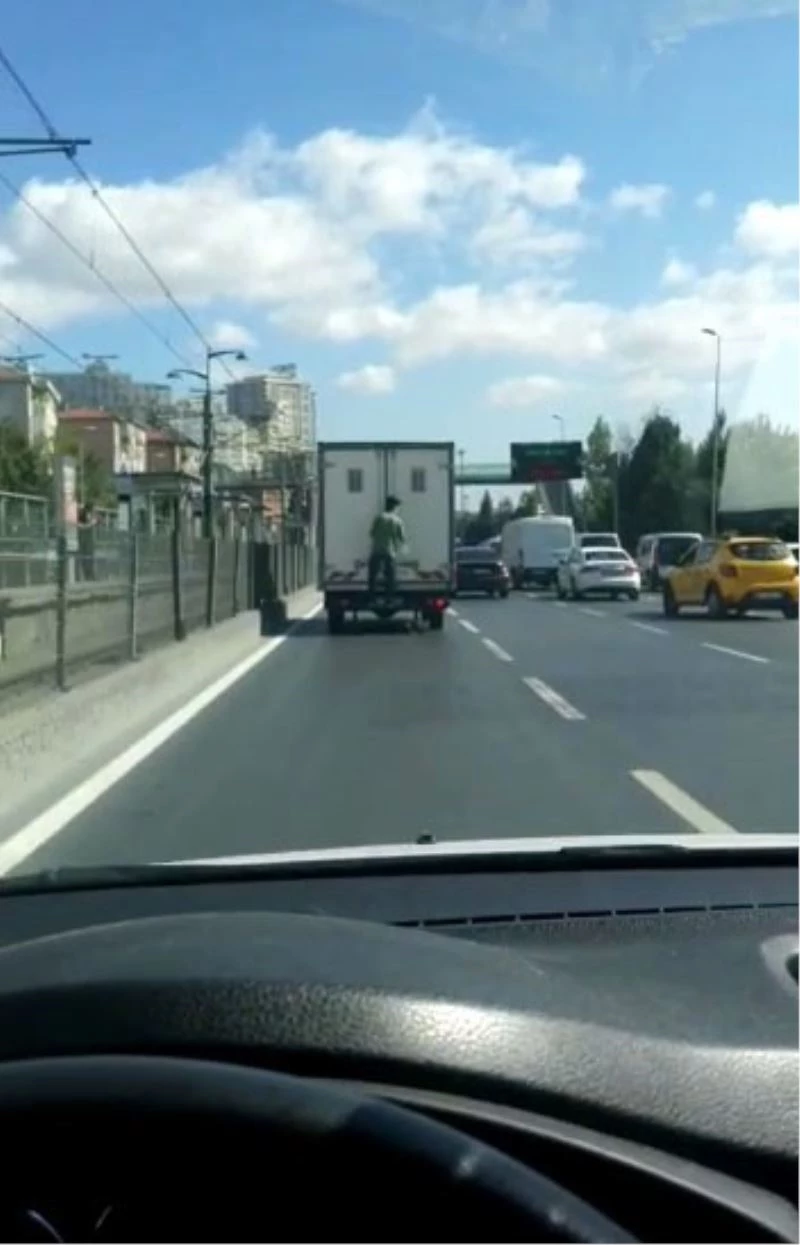 Arnavutköy - Sultangazi yolunda kaydedilen görüntülerde bir kişi, kapalı kasa kamyonetin arka tarafından sarkarak seyahat etti. Tehlikeli yolculuk o esnada yoldan geçen diğer vatandaşların cep telefonu kameraları tarafından kaydedildi.