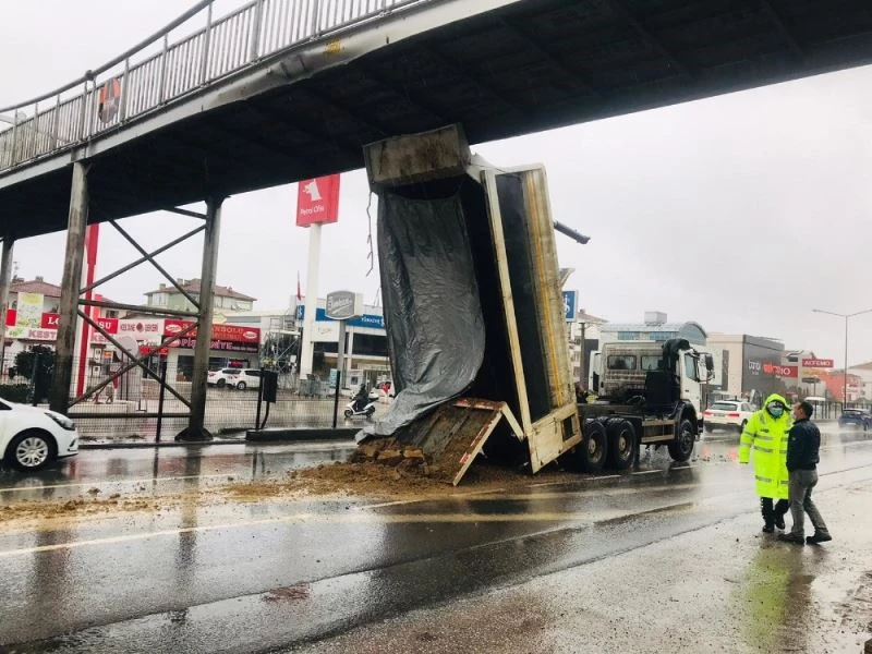 Yalova-İzmit yolunda hafriyat kamyonunun açılan damperi üst geçide çarparak hasara sebep oldu.