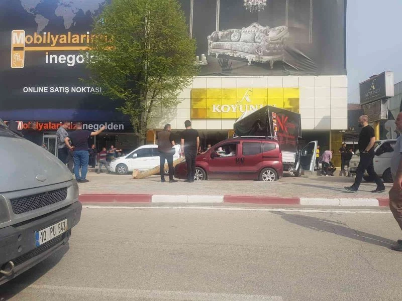Bursa’nın İnegöl ilçesinde kamyonun kasasındaki 2 ton ağırlığındaki tomruk üç aracın üzerine düştü. Olay sırasında araçlarda yolcuların olmaması faciayı önledi.