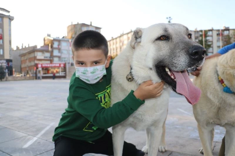 Sivas’ta Kongre Müzesi önünde kangalları gören çocuklar onları sevip okşadı. Doğada Kurtların korkulu rüyası ve en acımasız düşmanları olan kangalların çocuklara karşı ne kadar merhametli oldukları gözler önüne serildi.
