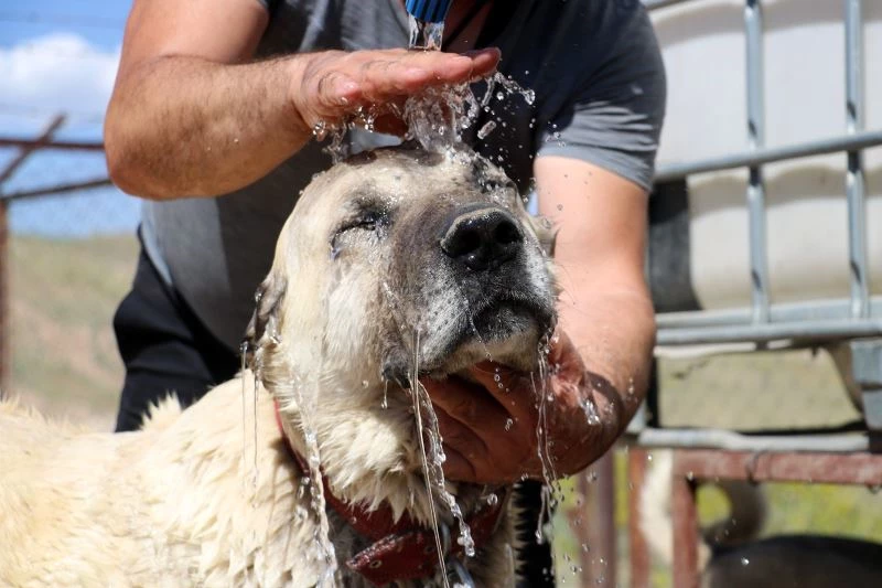 Sivas’ta kangal köpeklerine, kavurucu sıcaklardan etkilenmemeleri için soğuk suyla duş yaptırılıyor.