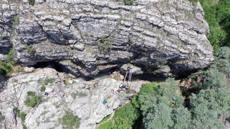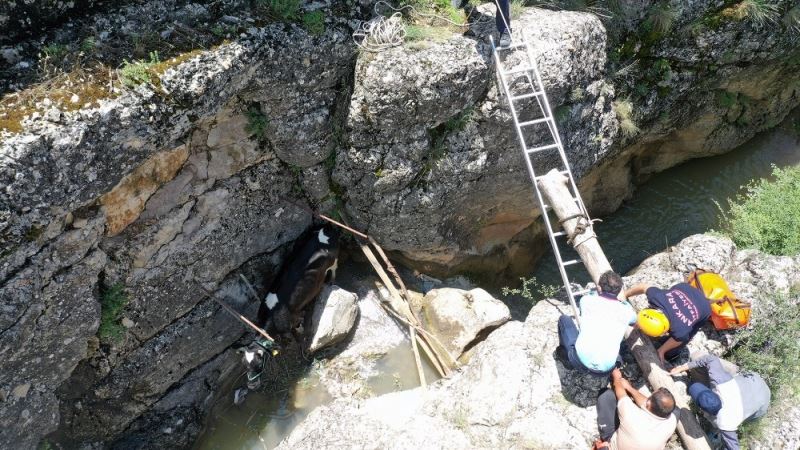 Kanyonda mahsur kalan hamile ineği itfaiye kurtardı