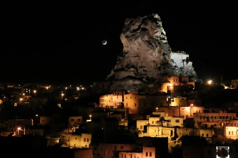 Türkiye’nin önemli turizm merkezlerinden Kapadokya bölgesinde sokağa çıkma kısıtlaması devam ederken bölgenin gece görüntüsü kendisine hayran bıraktı. Nevşehir’in merkez ilçeye bağlı Uçhisar, Göreme beldelerinin yanı sıra Ürgüp üç güzeller ve Ortahisar Kalesinin ışıklandırmayla birlikte gece görüntüsü kendisine bir kez daha hayran bırakırken Ortahisar Kalesi ile ayın bütünleşmesi ise objektiflere yansıdı.