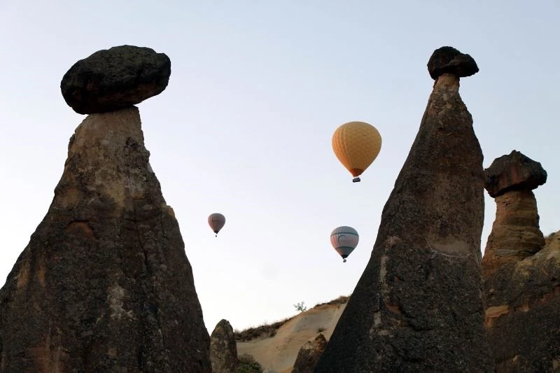 Türkiye’nin dünyaca ünlü en gözde turizm merkezi Kapadokya’da gün doğumuyla birlikte havalanan sıcak hava balonları gökyüzünde görsel şölen sundu.