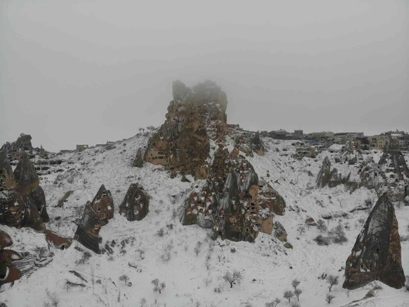 Kapadokya’da etkili olan kar yağışı; doğal, tarihi ve kültürel güzelliklerle bezeli vadilerde eşsiz görüntülerin ortaya çıkmasına neden oldu.