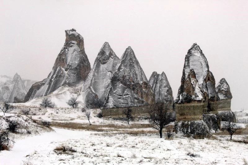 Türkiye’nin önemli turizm merkezlerinden Kapadokya bölgesinde yağan kar yağışıyla birlikte peribacaları tablo gibi fotoğraflar verdi.