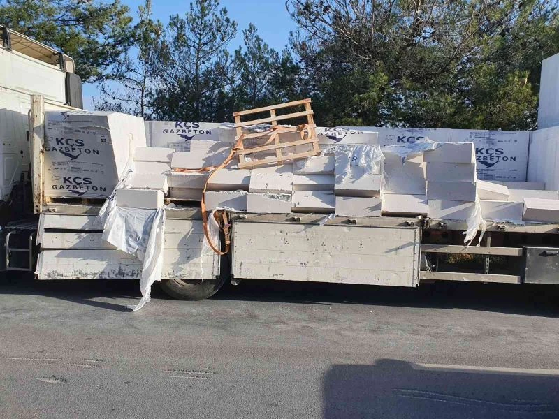 Muğla’nın Bodrum ilçesinde gaz beton yüklü tırdaki betonların bir kısmı, karayoluna döküldü. Tırın arkasından gelen bir otomobilin dökülen gaz betonlara çarptığı kaza, maddi hasarla atlatıldı.