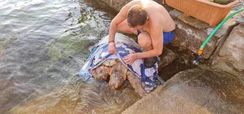 Muğla’nın Bodrum ilçesinde denizde bitkin halde olduğu görülen yetişkin bir caretta caretta cinsi deniz kaplumbağası, vatandaşlarca kıyıya getirildi. Mahalle sakinleri kaplumbağayı hayatta tutmak için seferber oldu.