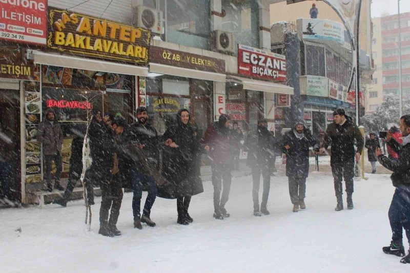 Mardin’in Kızıltepe ilçesinde 2 yıl aradan sonra yağan kar vatandaşlar tarafından sevinçle karşılandı. Kendini dışarı atan gençler kar altında halay çekti.
