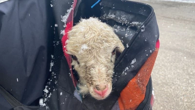 Mustafa Çelik, “Kar yağmaya başladığı anda koyun baktım sancılandı, doğum yapıyor. Hiç dokunmadım. Annesini biraz emdikten sonra üşümesin diye çantamda evime götürüyorum’’ dedi.