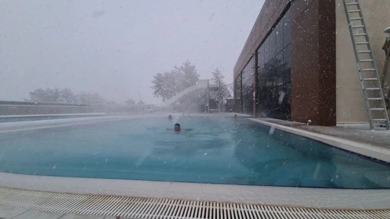 Uşak’ta yağan karı fırsat bilen vatandaşlar, eksi 16 derecede termal havuza giderek karlı havada havuzun keyfini çıkardı.