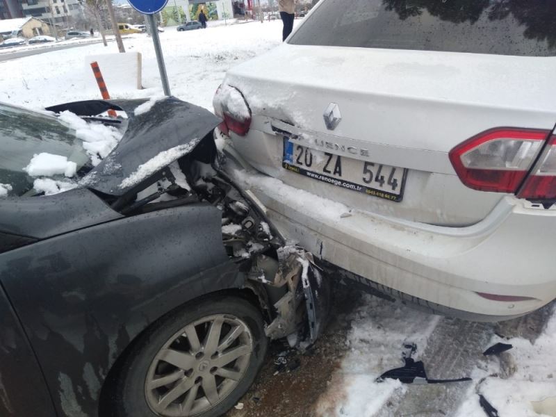 Kaza, Merkezefendi ilçesi Başkarcı Mahallesinde meydana geldi. Edinilen bilgilere göre, sabah etkili olan karın etkisiyle kayganlaşan yolda 20 V 7528 plakalı araç sürücü Ümit Özdemir, direksiyon hakimiyetini kaybetmesi sonucu önündeki 20 ZA 544 plakalı Ahmet Öztürk’e çarptı. Çarpmanın etkisiyle Ahmet Öztürk kayarak döner kavşakta bulunan aydınlatma direğine çarptı. Arkadan gelen araçlar hızını yavaşlatarak zincirlemeli kazanın önüne geçerken sürücüler,112 Acil Çağrı Merkezi’ni arayarak yardım istedi. Bölgeye gelen ekipler trafiği kontrollü şekilde sağladı. Araçlar çekici yardımıyla kaza yerinden kaldırıldı. Kazada sürücüler yara almadan kurtulurken her iki araçta maddi hasar meydan geldi.