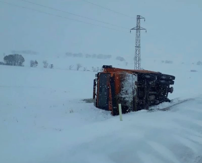 Çorum’un Sungurlu ilçesinde, karla kapanan yolları açmak için çalışan kar küreme aracı şarampole devrildi.
