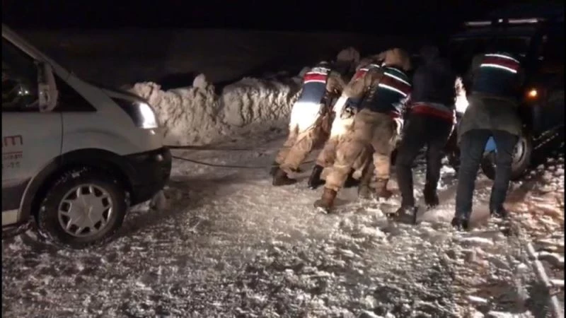 Kara saplanan araçları kurtaran jandarma ekipleri üşüyen vatandaşlara gerekli yaşam yaşam malzemesi ikram edildi.