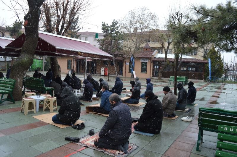 Eskişehir’de bazı vatandaşlar, sabah saatlerde başlayan ve öğlen saatlerinde şiddetini arttıran kar yağışı altında cuma namazı ibadetini cami dışında açık alanlarda yerine getirdi.