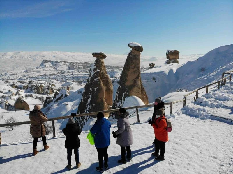 Nevşehir’de etkili olan kar yağışının ardından Kapadokya bölgesi beyaz örtüyle kaplandı. Türkiye’nin önemli turizm merkezlerinden olan Kapadokya’da kar kalınlığı yer yer 50 santimetreye ulaştı. Peribacaları ve doğal kaya oluşumlarıyla yerli ve yabancı turistlerin ilgi odağı olan Kapadokya, kar örtüsüyle birlikte eşsiz bir güzelliğe büründü. Göreme, Ürgüp, Zelve-Paşabağları, Çavuşin ve Uçhisar gibi bölgeleri ziyaret eden yerli ve yabancı turistler beyaz manzarayı fotoğrafladı.
