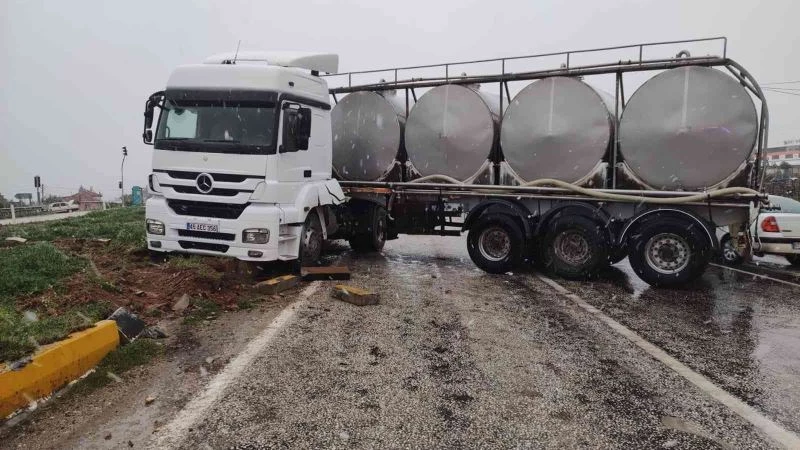 Manisa’nın Alaşehir ilçesinde kar yağışı nedeniyle kayganlaşan yolda sürücüsünün direksiyon hakimiyetini kaybettiği tır refüje çarparak durabildi. Kazada tır sürücüsü hafif şekilde yaralandı.