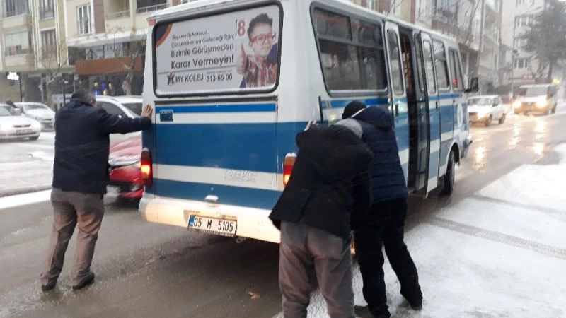 Merzifon’da dün akşam saatlerinden itibaren başlayan ve bugünde aralıklarla yağan kar ile ilçe merkezi ve köylerini beyaza büründü. İlçe geneli beyaz örtüyle kaplanırken sürücüler araç kullanmakta güçlük çekti. Soğuk hava ile birlikte yollarda oluşan buzlanma nedeniyle trafikte seyreden bir dolmuş ilerleyemeyince dolmuşu taşıdığı yolcular itti.