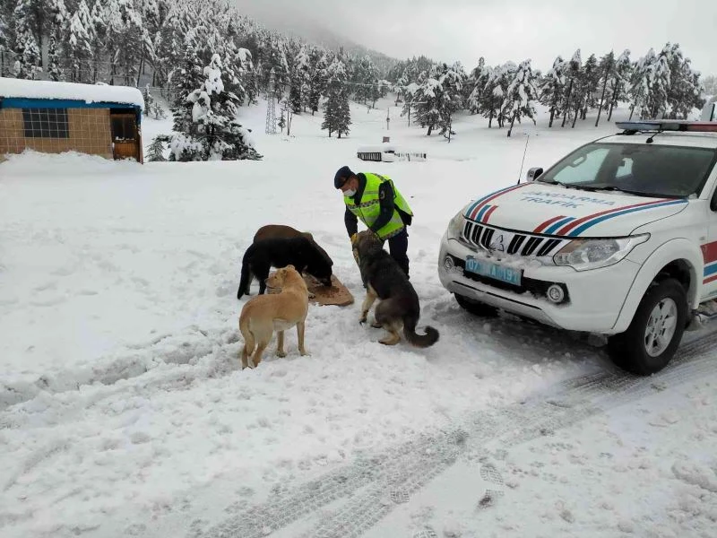 Antalya Akseki İlçesi Alacabel mevkiinde etkili olan yoğu kar yağışı sonrası yolda kalan vatandaşların imdadına yetişen Jandarma Trafik Timleri, soğukta donmak üzere olan sokak hayvanlarının da yiyecek dağıttı.