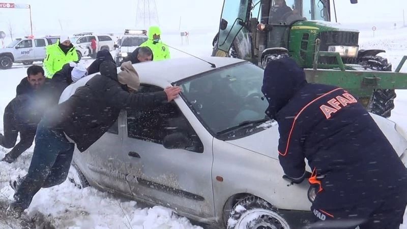 Karda mahsur kalan araçlar kurtarıldı