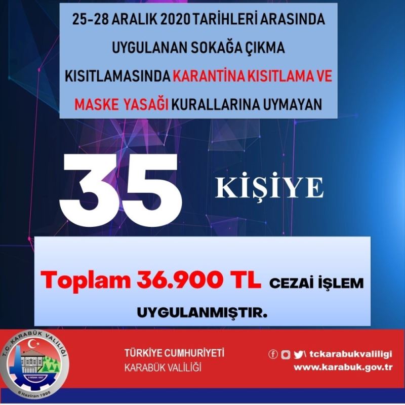 İçişleri Bakanlığınca 81 ile gönderilen genelge ile 25 Aralık 2020 Cuma saat 21.00 ile 28 Aralık 2020 Pazartesi günü saat 05.00 saatleri arasında uygulanan sokağa çıkma kısıtlaması sona erdi. Karabük Valiliği 56 saatlik sokağa çıkma kısıtlaması süresi boyunca kent genelinde 35 kişinin ihlal ettiğini açıkladı.