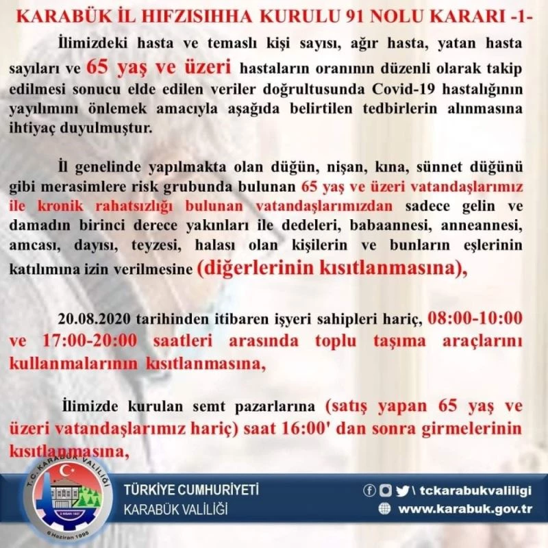 Karabük İl Hıfzıssıhha Kurulu, kentte hasta ve temaslı kişi sayısı ağır hasta yatan hasta sayıları ve 65 yaş ve üzeri hastaların oranının düzenli olarak takip edilmesi sonucu elde edilen veriler doğrultusunda Covid-19 hastalarının yayılımını önlemek amacıyla tedbirler alındığını duyurdu.