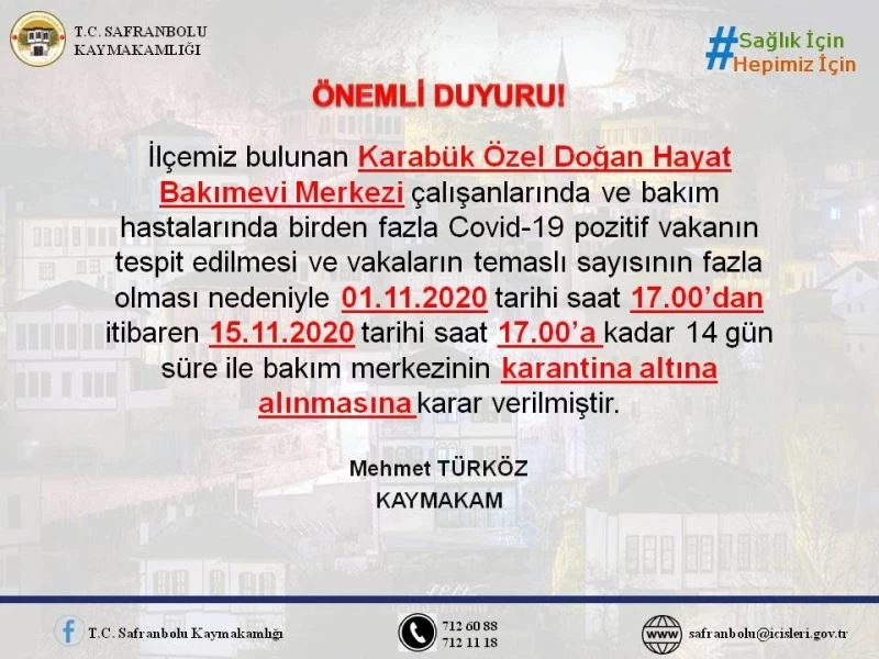 İlçeye bağlı Bostanbükü köyünde bulunan Karabük Özel Doğan Hayat Bakımevi Merkezi çalışanlarında ve bakım hastalarından birden fazla Covid-19 pozitifli vakalar tespit edildi. Konuyla ilgili Safranbolu Kaymakamlığı tarafından yapılan açıklamada, “Temaslı sayının fazla olması nedeniyle 01.11.2020 tarihi saat 17.00’dan itibaren 15.11.2020 tarihi saat 17.00’a kadar 14 gün süre ile bakım merkezinin karantina altına alınmasına karar verilmiştir” denildi.