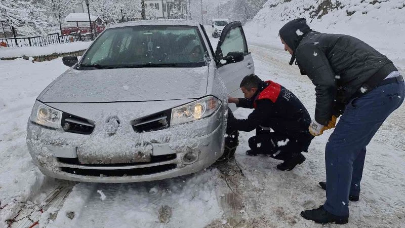 Meteoroloji Genel Müdürlüğünün uyarılarının ardından sabahın erken saatlerinden itibaren bastıran kar yağışı, Karabük’te hayatı olumsuz etkiledi. Kar yağışının şiddetini arttırmasıyla beraber Safranbolu’da karla kaplı yolda zincirsiz ilerleyen araçların sürücüleri zor anlar yaşadı. Safranbolu-Bartın istikametine seyir halinde olan bazı araç sürücüleri rampalarda yolda kalırken, bazıları geri dönmek zorunda kaldı. Yoluna devam etmek için zincir takmaya çalışan sürücülerin yardımına Safranbolu Belediyesi İtfaiye Müdürlüğü ekipleri yetişti. Ekiplerin yardımcı olmasıyla birlikte sürücüler yoluna devam etti.