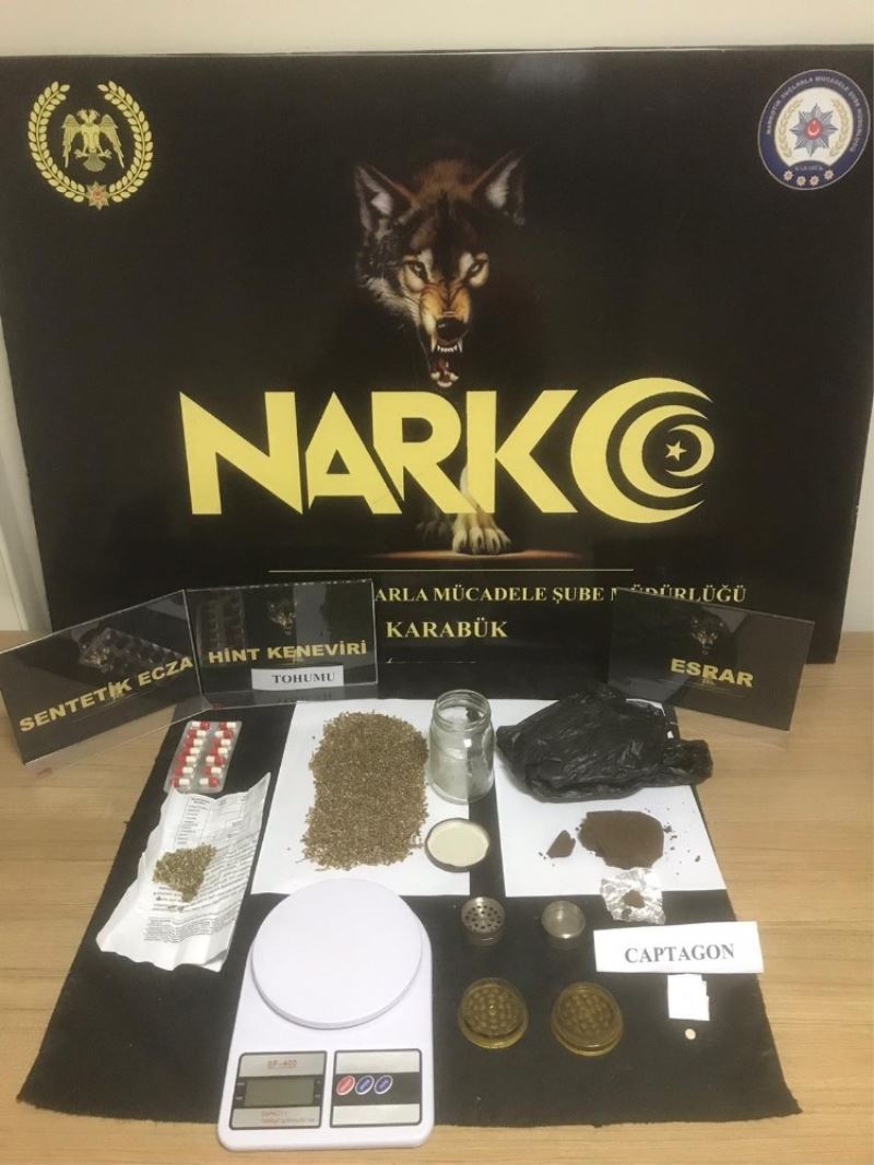 Edinilen bilgiye göre, Karabük Emniyet Müdürlüğü Narkotik Suçlarla Mücadele Şube Müdürlüğü ekleri kentte A.A. ve M.D. isimli uyuşturucu madde sattığı tespit etti. Ekiplerin şahısların birlikte kaldığı ikametlerine operasyon yaptı. Ekiplerin yaptığı arama neticesi kavanoz içerisinde daralı ağırlığı 260 gr gelen hint keneviri tohumu, 14 adet yeşil reçeteye tabi Perge hap, daralı ağırlığı 89,62 gr gelen sıkıştırılmış reçine esrar maddesi, 1 adet Captagon hap, hassas terazi ve 2 adet brender öğütücü, ele geçirildi. Uyuşturucu Madde Temin ve Ticareti (TCK 188) suçlarından gözaltına alındıktan sonra adliyeye sevk edilen şahsılardan A. A. tutuklanırken, M.D. ise adli kontrol şartı ile serbest bırakıldı.